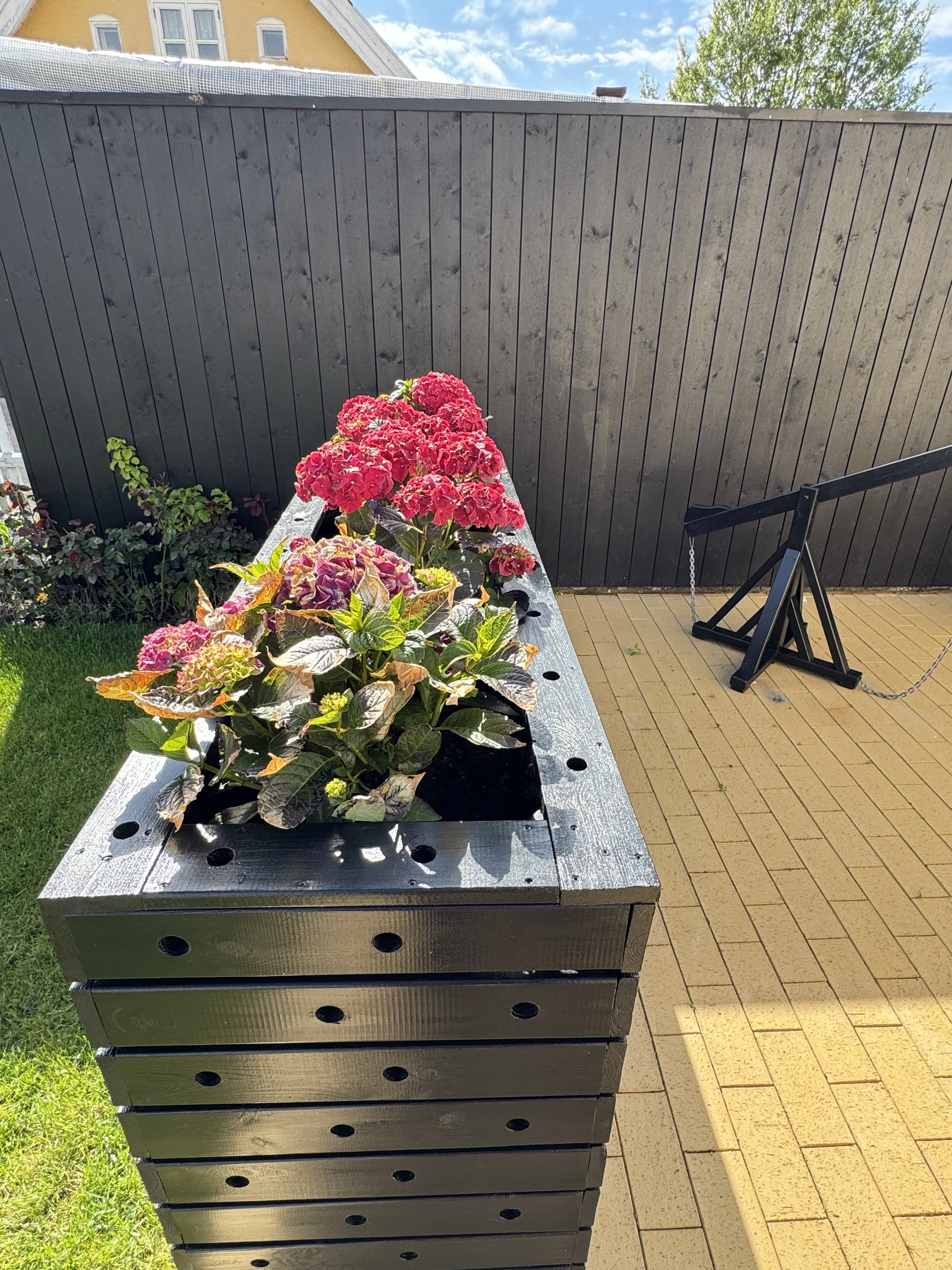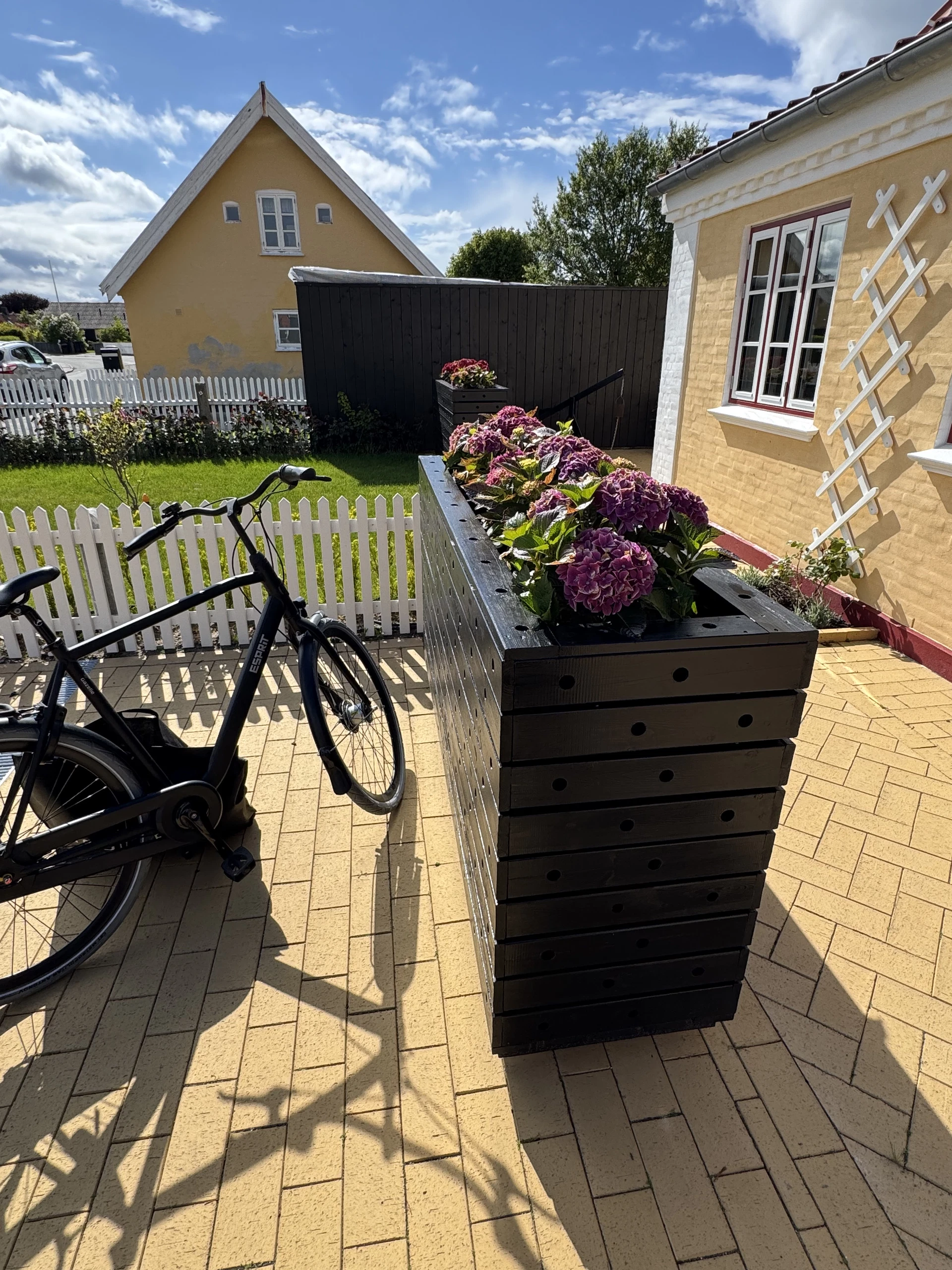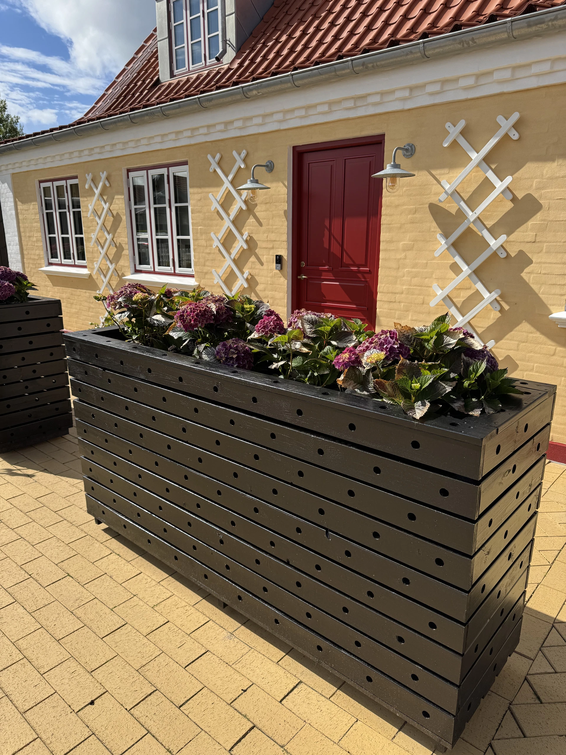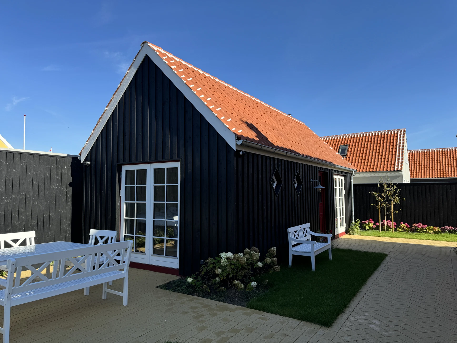 Udhuse og skure opført med lodretstående bræddebeklædning, sortmalet.