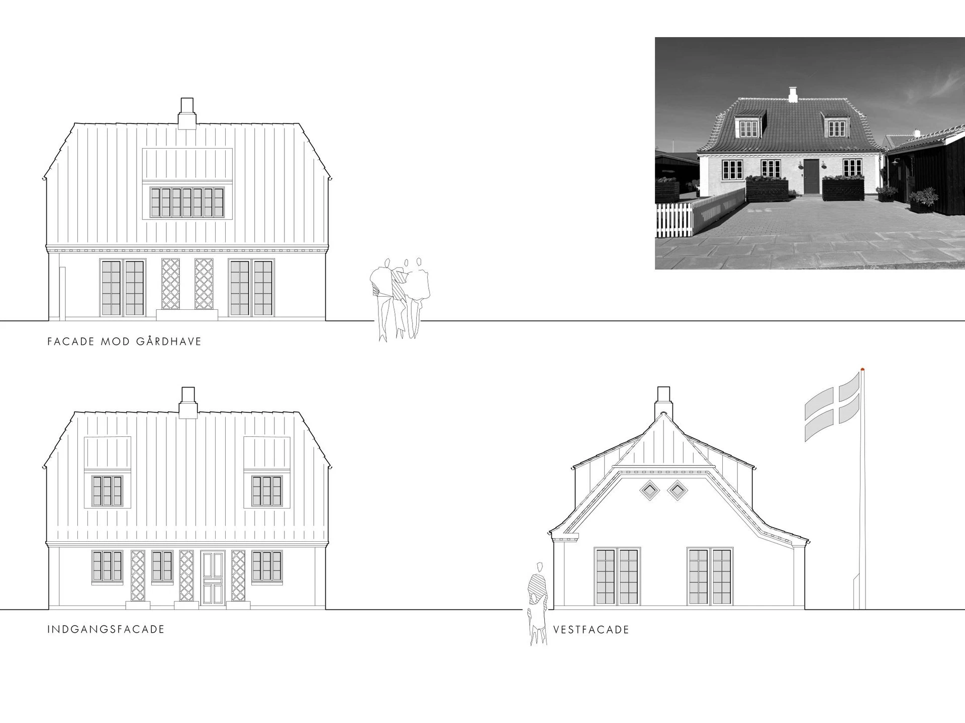 Rødt tegltag med hvidmalede stafferinger langs rygning, grater og gavle. Gulmalede og vandskurede teglstensfacader samt hvidmalede gesimsudkragninger, murhjørner og vinduesfalse.