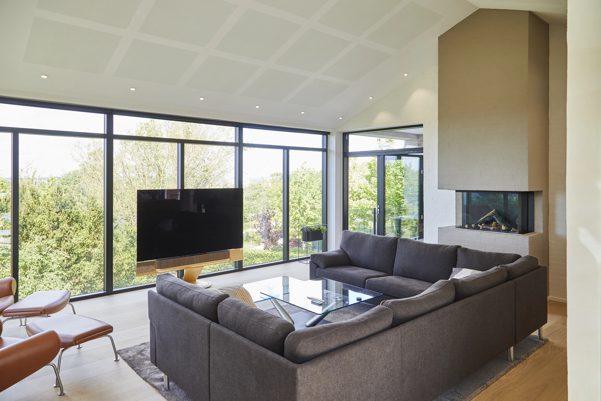 Indvendigt er huset tilpasset og ombygget til den moderne familie med store og åbne opholdsrum - der er samtidigt opført tilbygning med hall, værelser og udsigts stue.