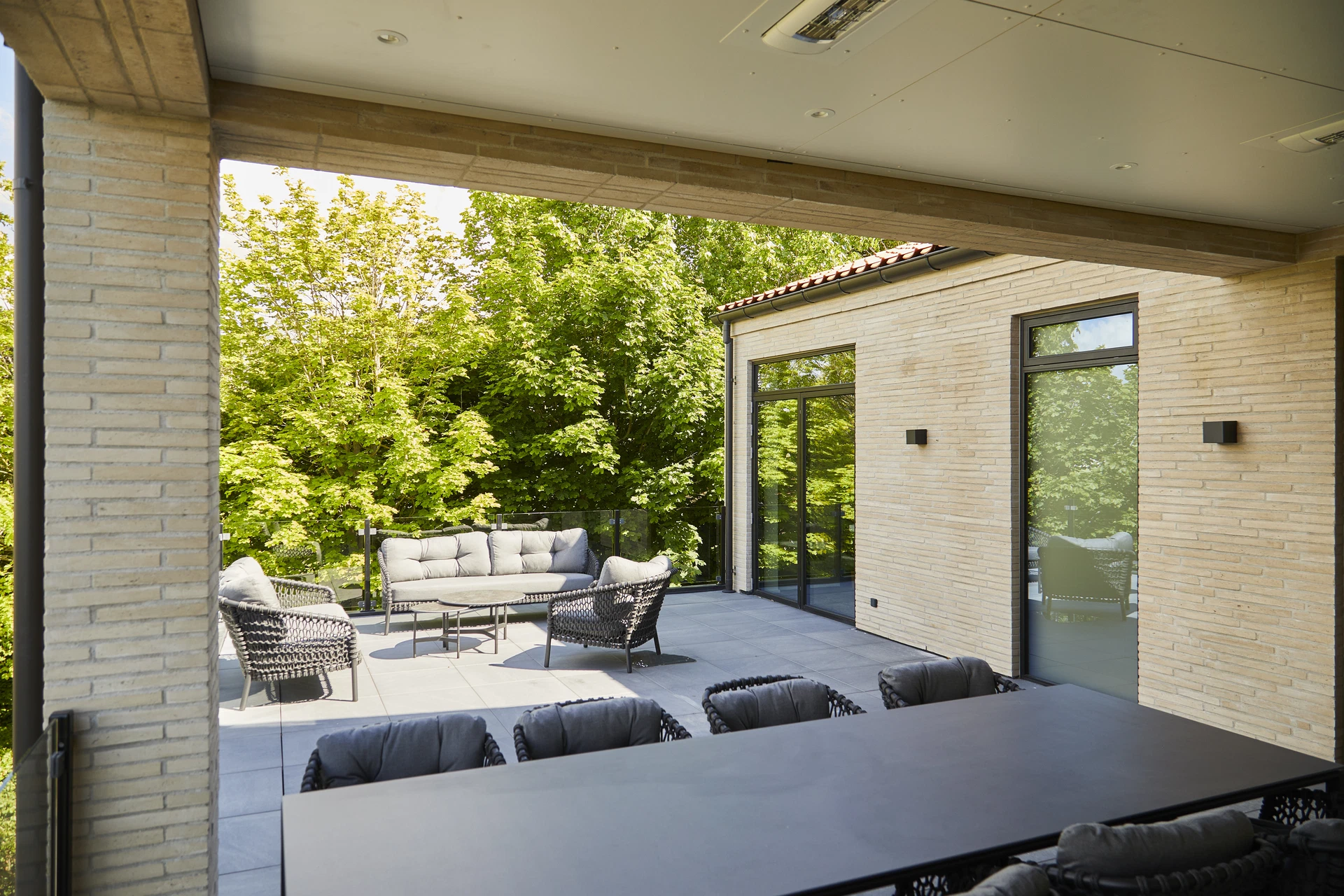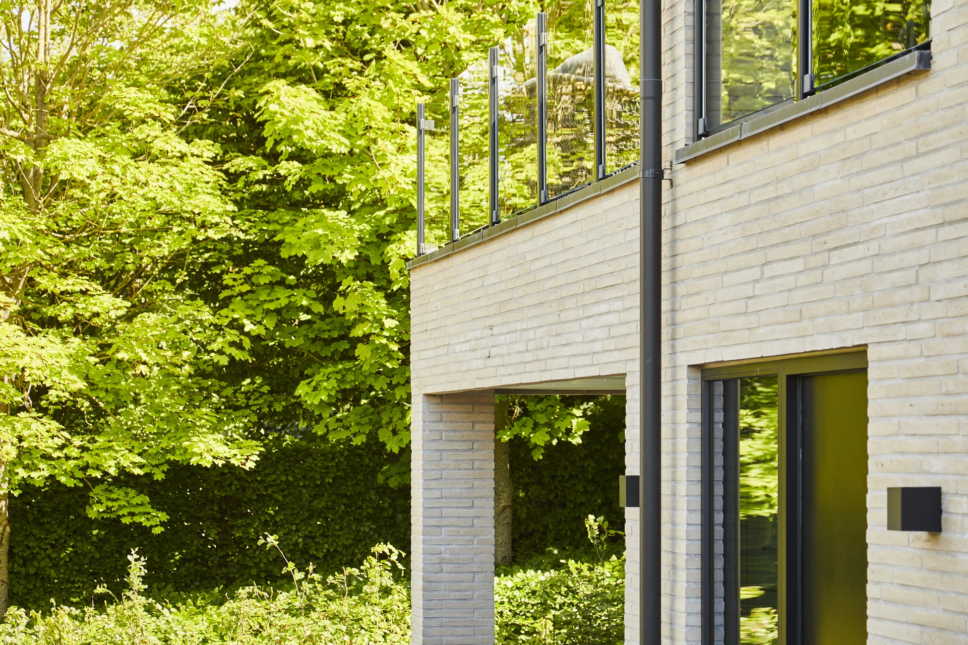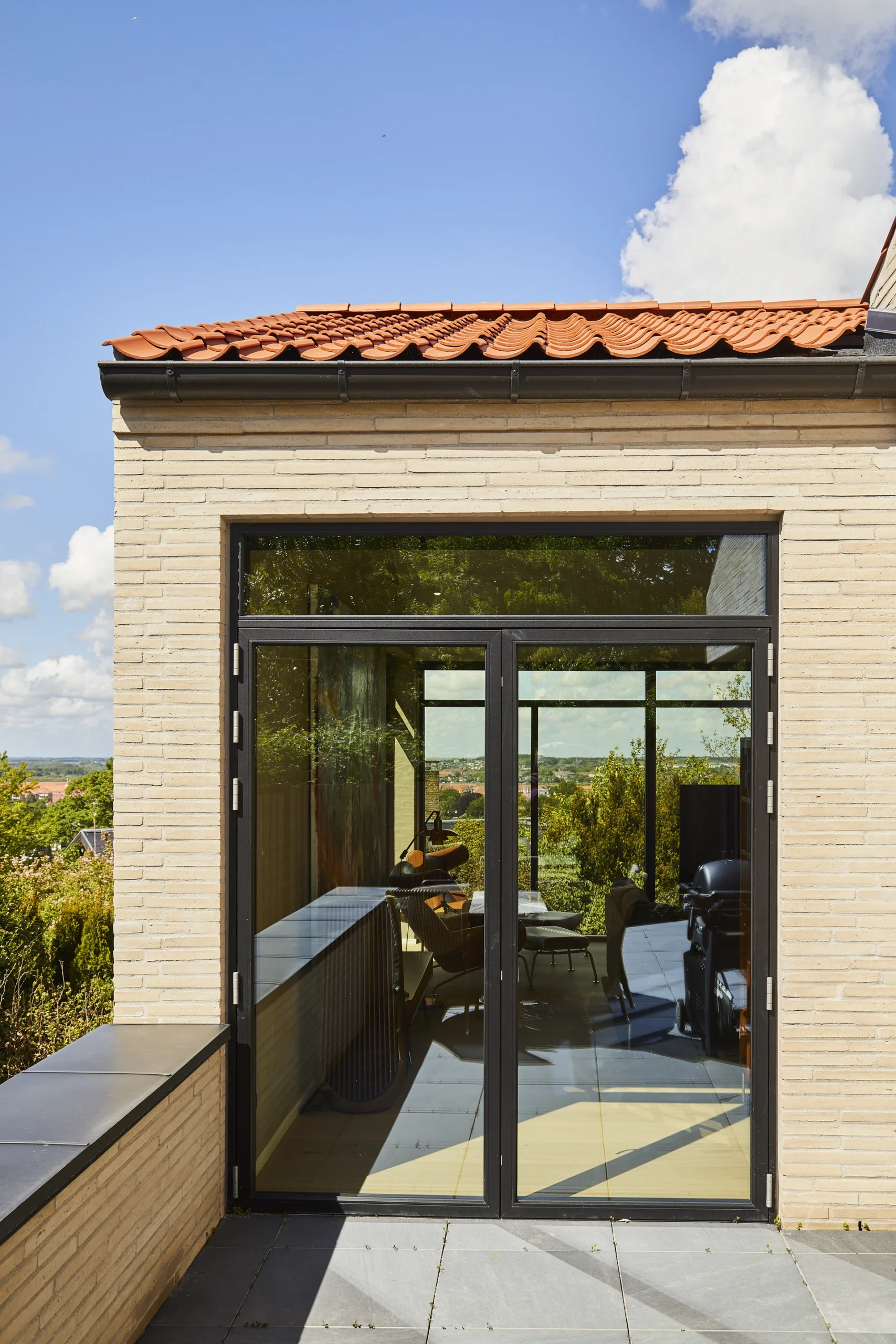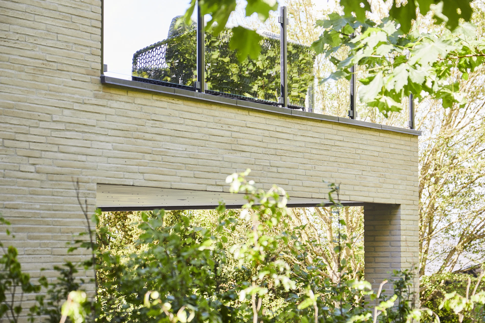 Det udvendige materialevalg indeholder murede facader med gule blødstrøgne facadesten fra Randers Tegl ”Ultima”, tagrender og nedløb i sort zink. Store vindues- og dørpartier forbinder inde og ude og sikrer et flot kig over Limfjorden - tagbelægning med røde tagtegl.