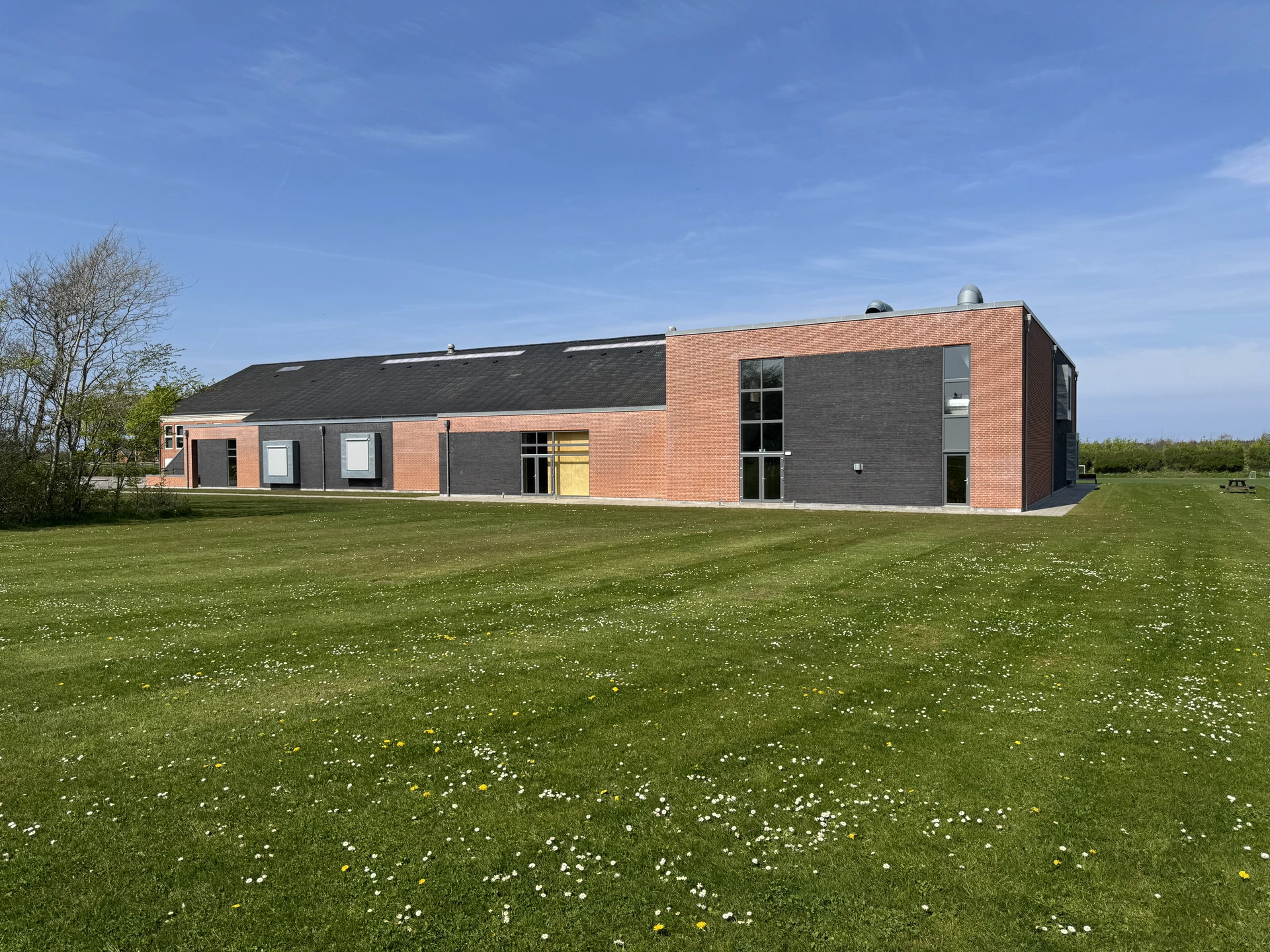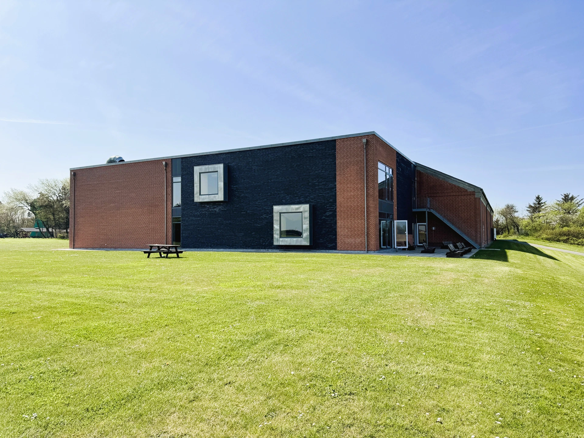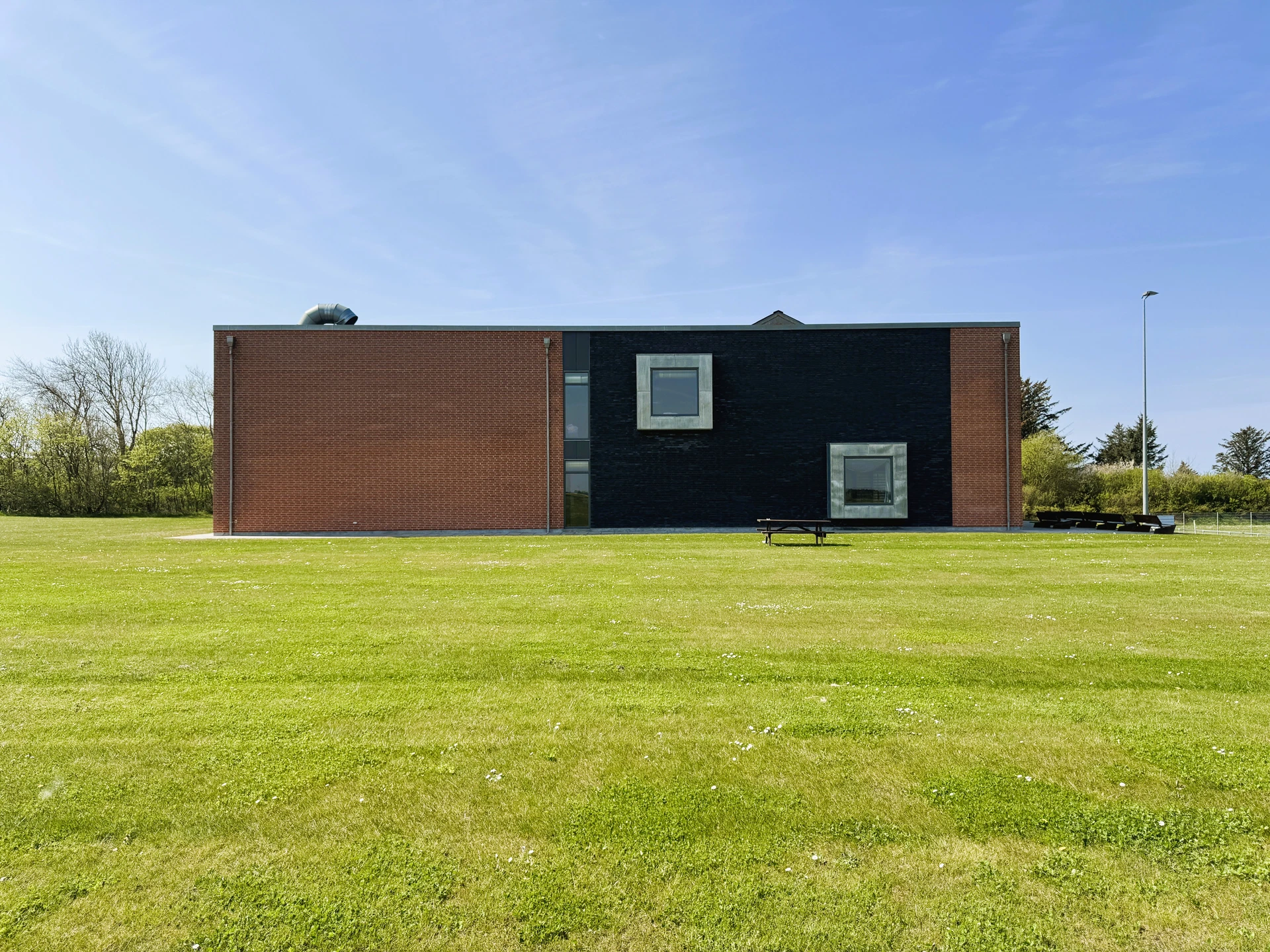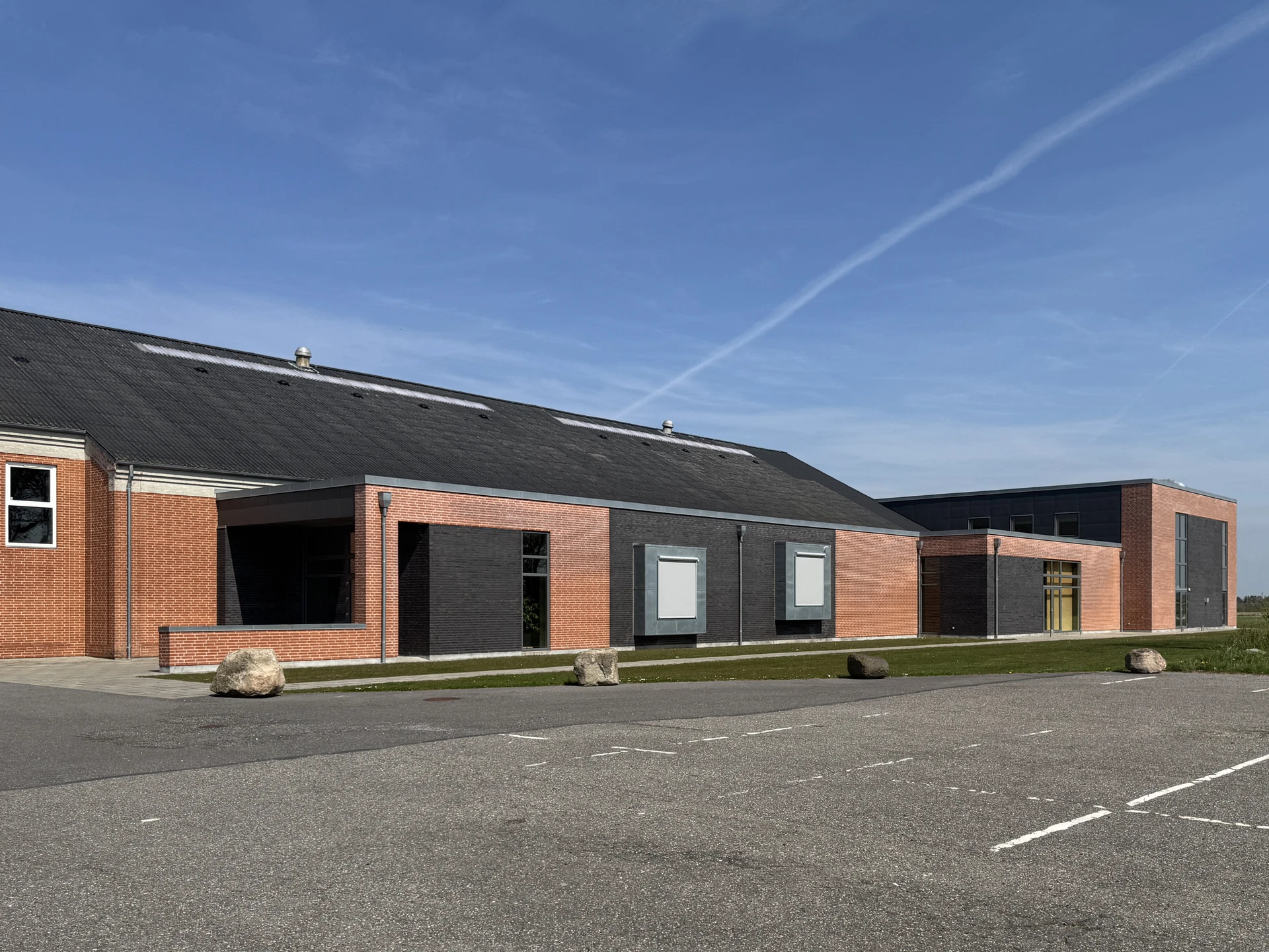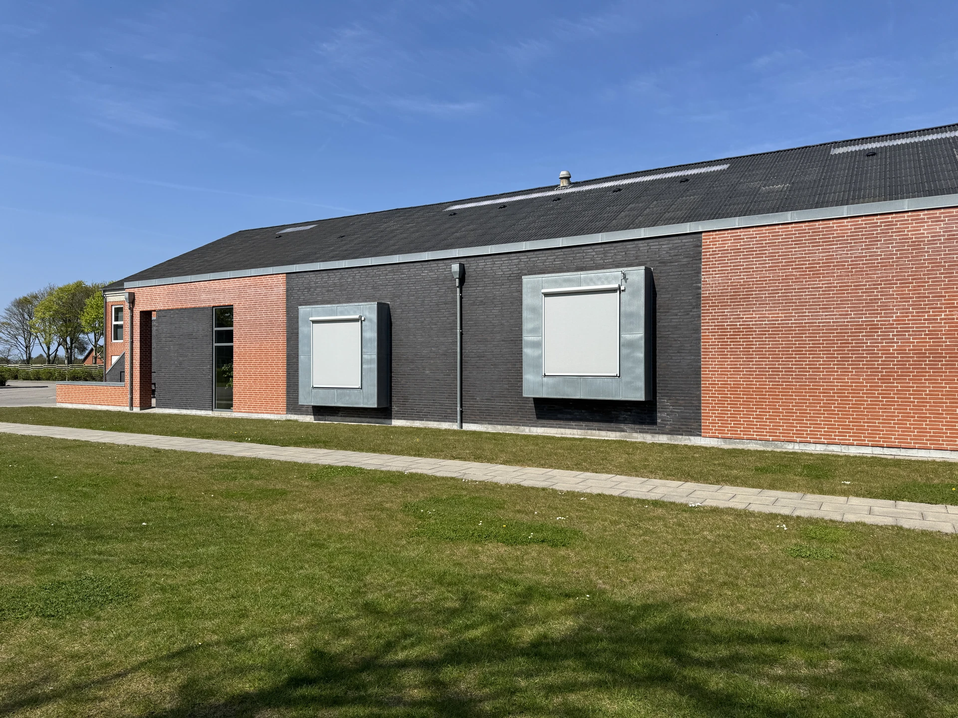Tilbygningen er opført i røde blødstrøgne teglsten, murværksflader brydes med felter af sorte facade tegl samt fremspring af zinkkarnapper - vinduer og døre som eksisterende.