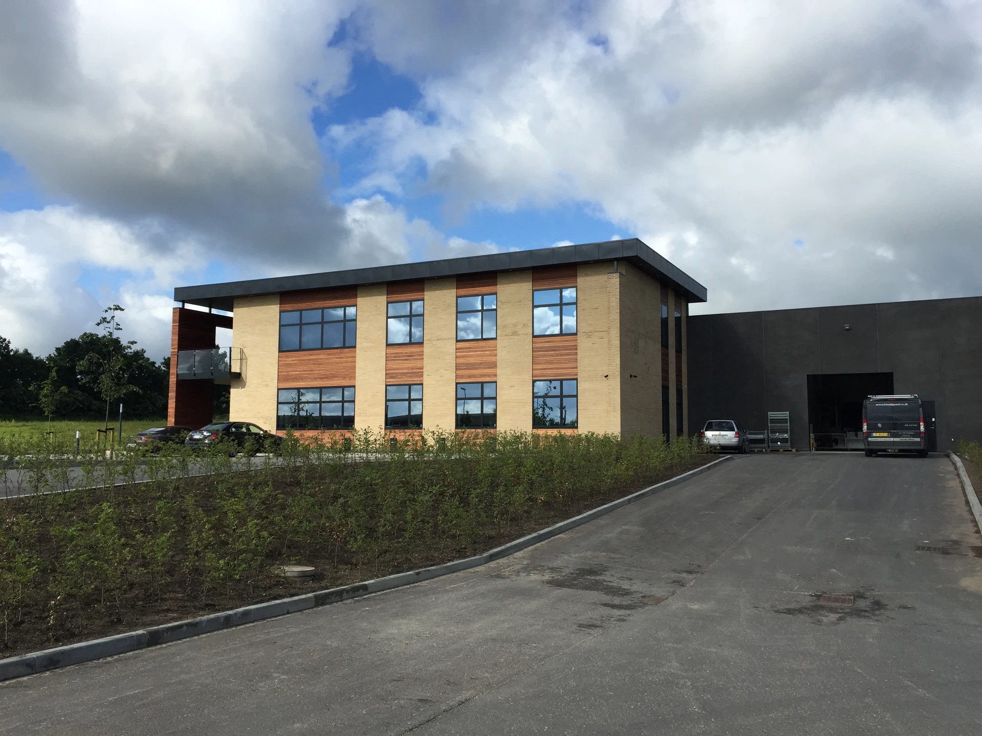 Administrationsbygningen i 2 etager er opført i gulve blødstrøgne teglsten med mørke/sorte vinduesbånd og olieret hårdt træ – lagerhaller er opført i beton med mørk overflade, samt sorte vinduesbånd og porte.