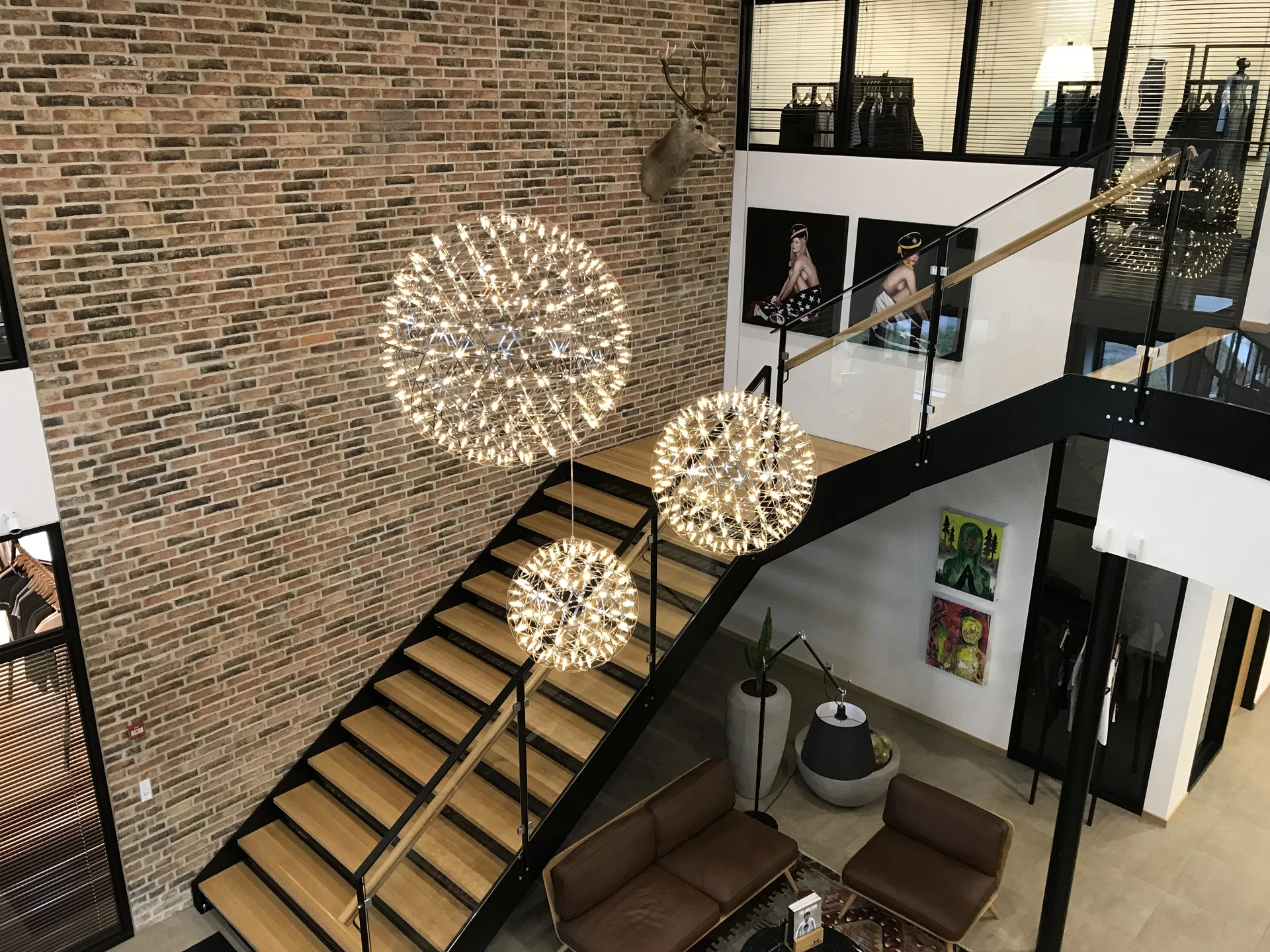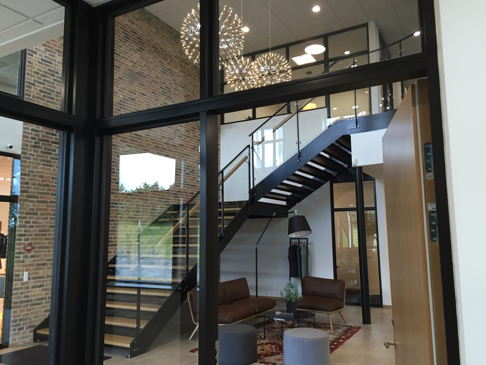 Indvendigt er indretning og materialevalg smagfuldt og industrielt - med rå murstensvægge, egetræ og sorte snedkerpartier, flot trappe i sort stål, massivt egetræ og glas.