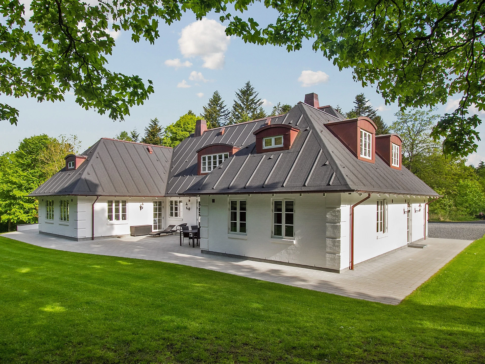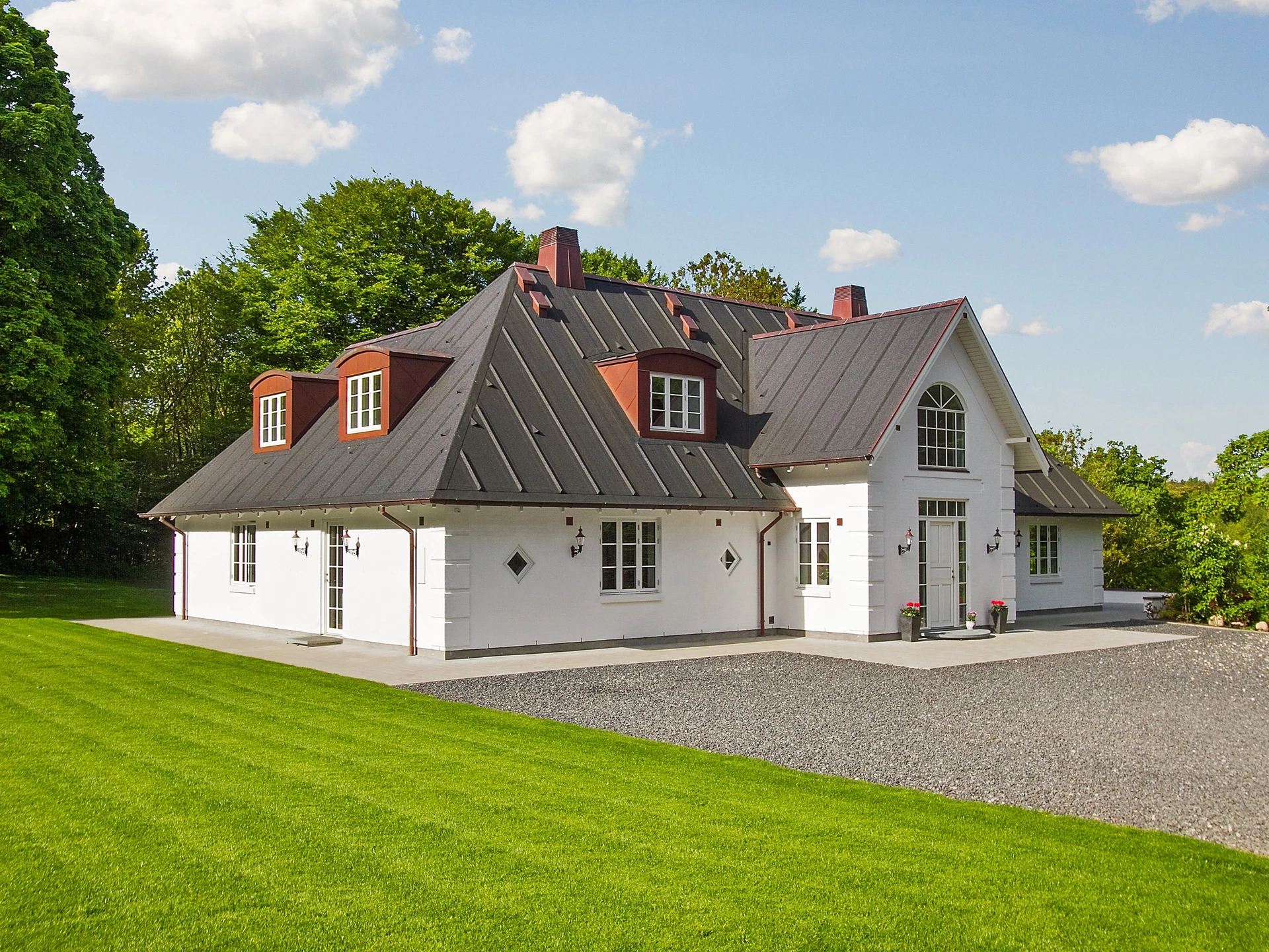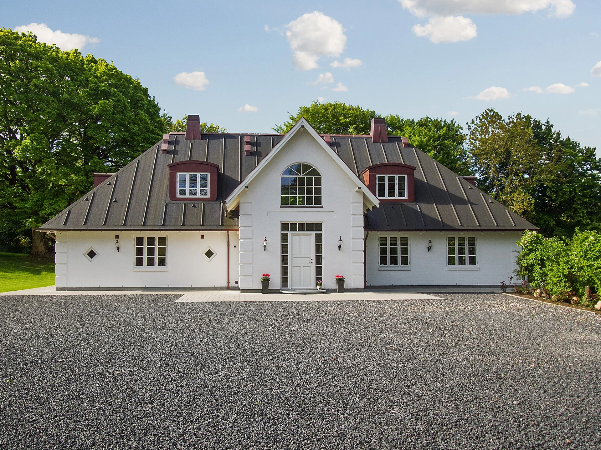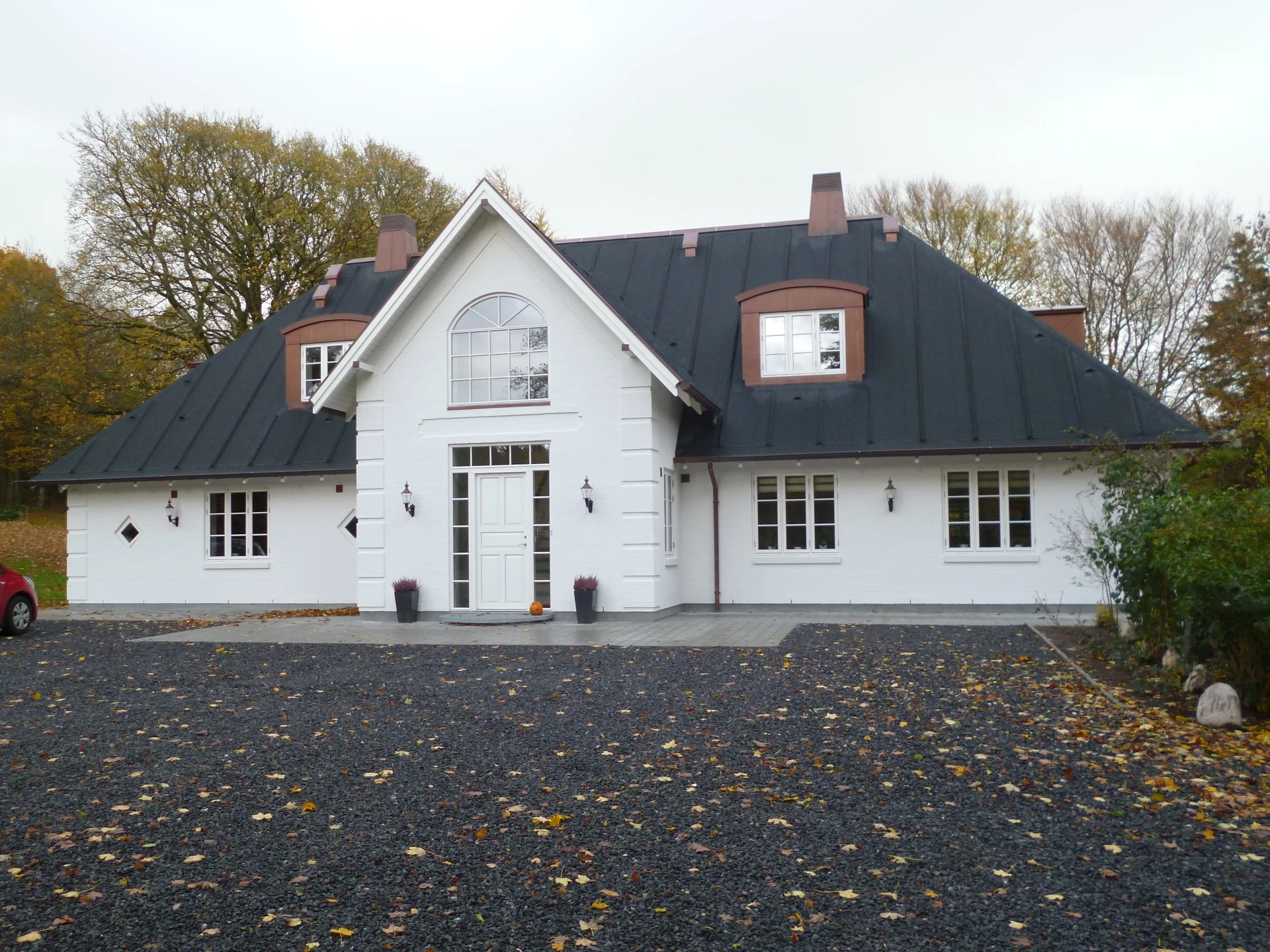 Hvidmalede og vandskurede teglstensfacader med fremspring i murhjørner. Klassiske opsprossede vinduer i hvid farve. Flot massiv fordør med udskæringer og messinggreb.
