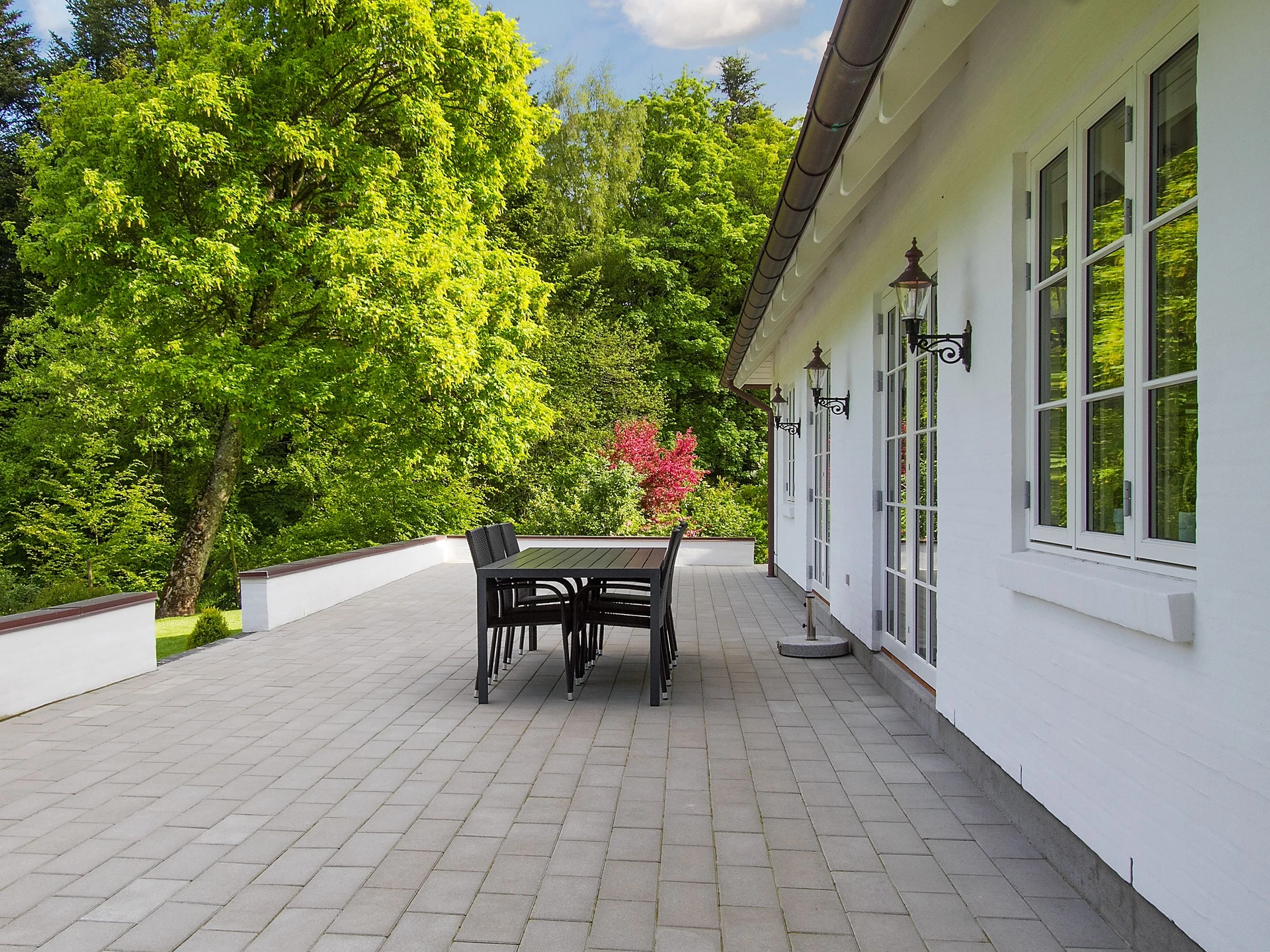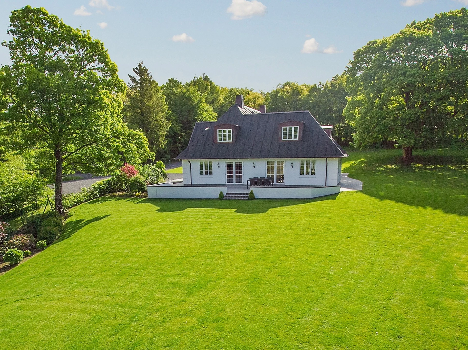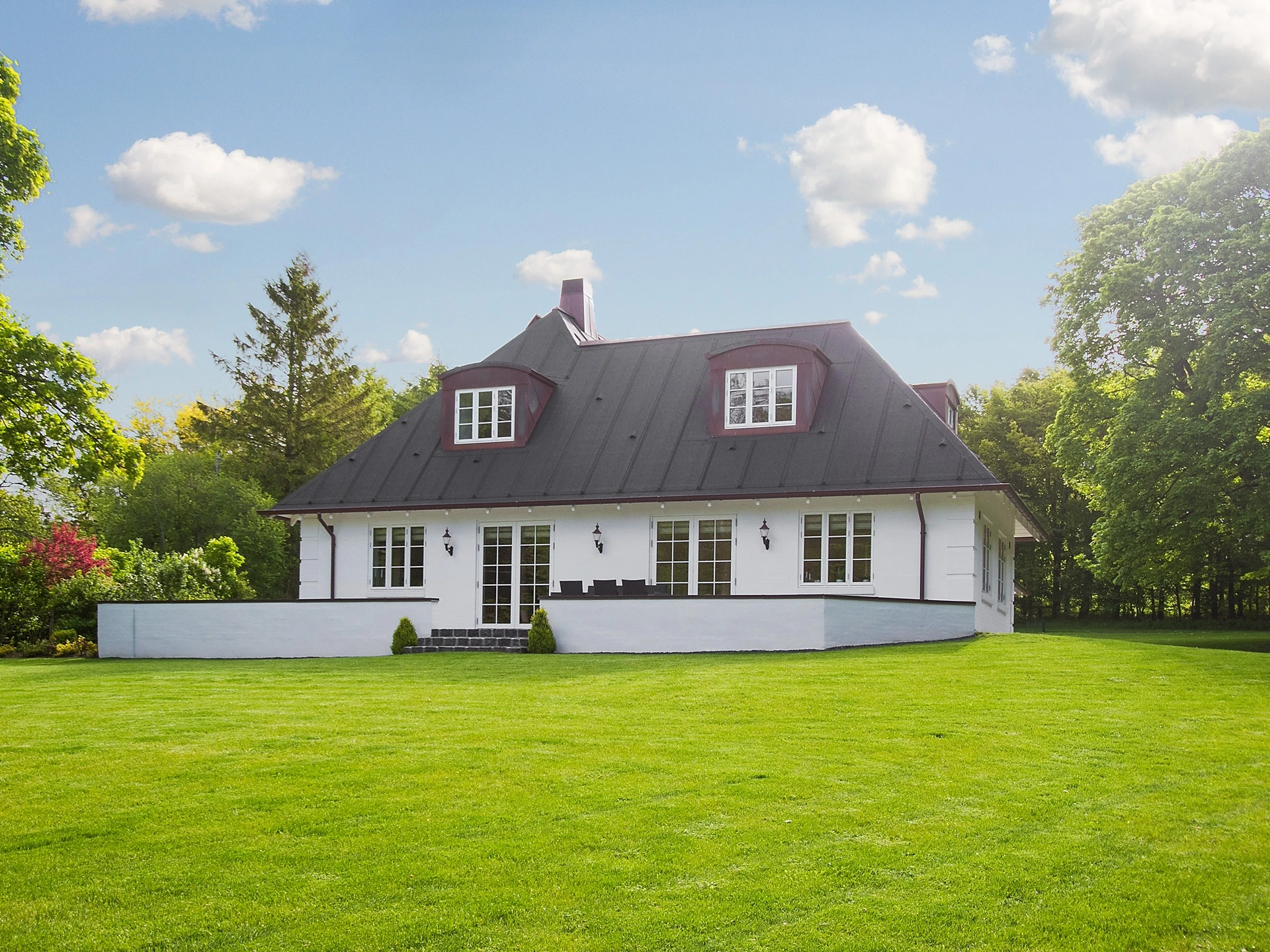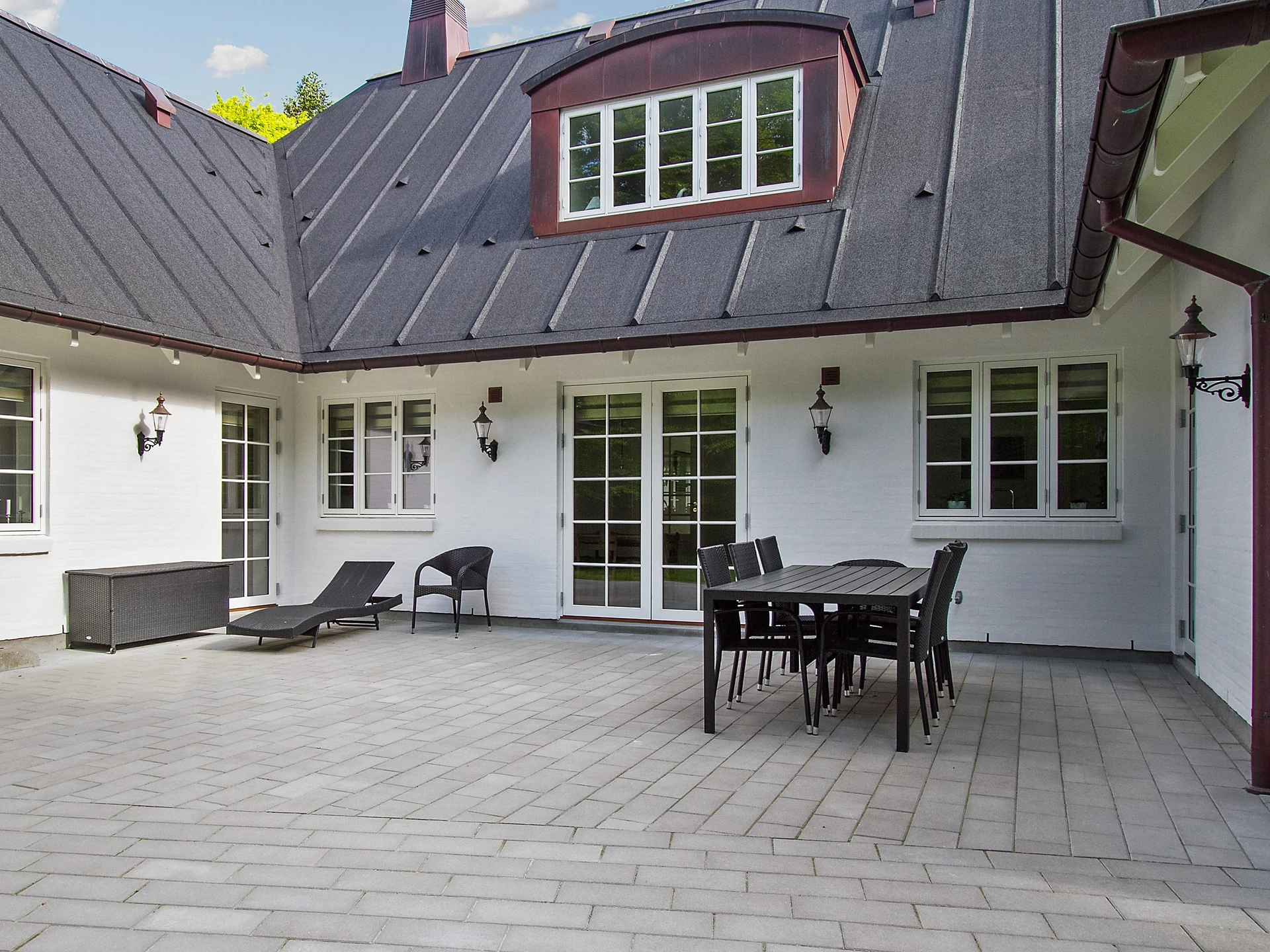 Hvidmalede og vandskurede teglstensfacader med fremspring i murhjørner. Klassiske opsprossede vinduer i hvid farve. Flot massiv fordør med udskæringer og messinggreb.