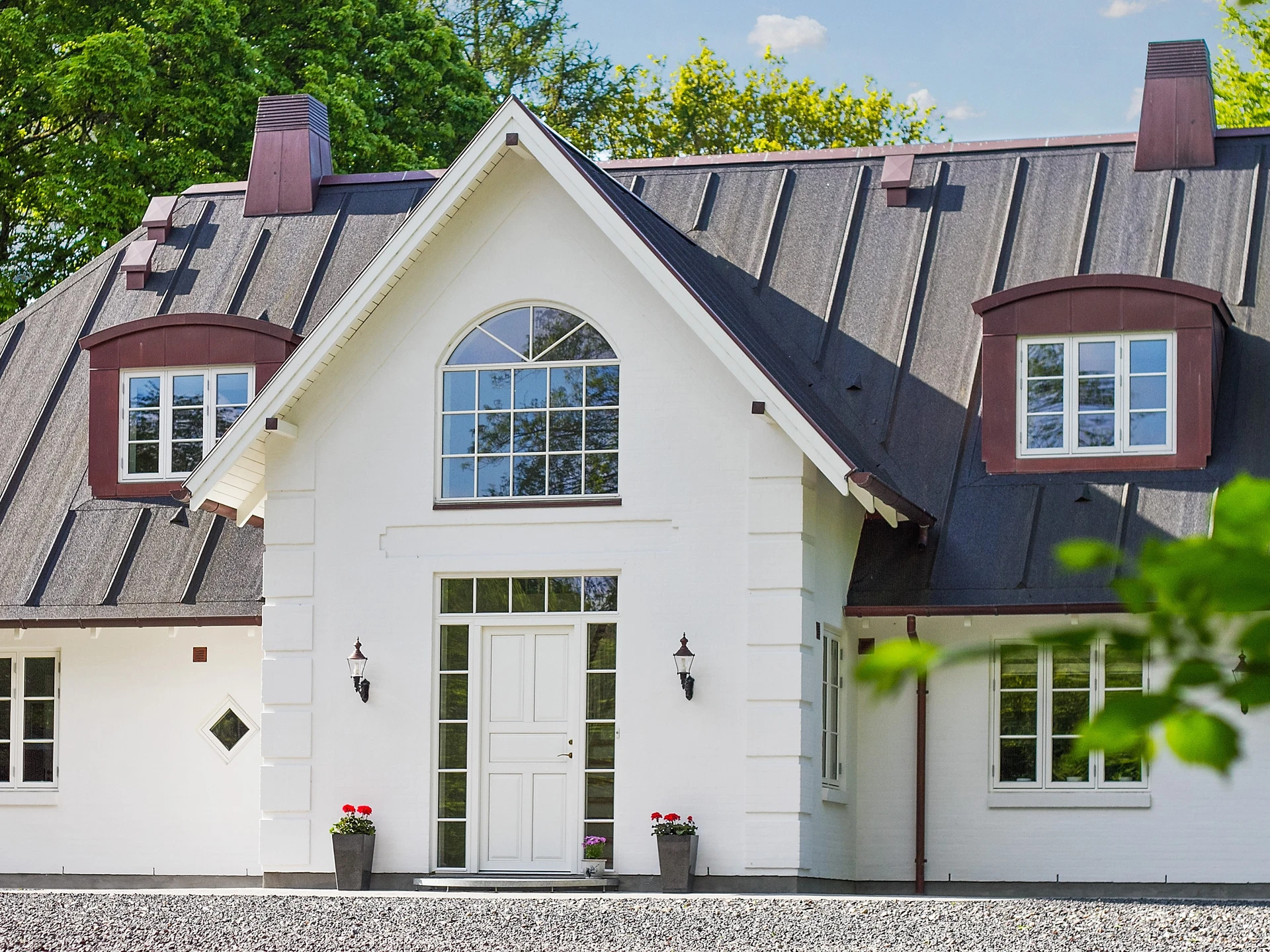 Afvalmet tagkonstruktion med tagpap og trekantslister – tagudhæng er udført med synlige spærender. Rygninger, skorstene, kviste og tagrender mm. i kobber.